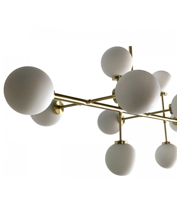 Suspension en métal doré et ses 10 globes en verre opale blanc de 12cm de diamètre.