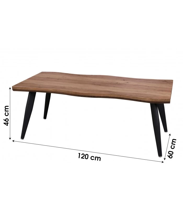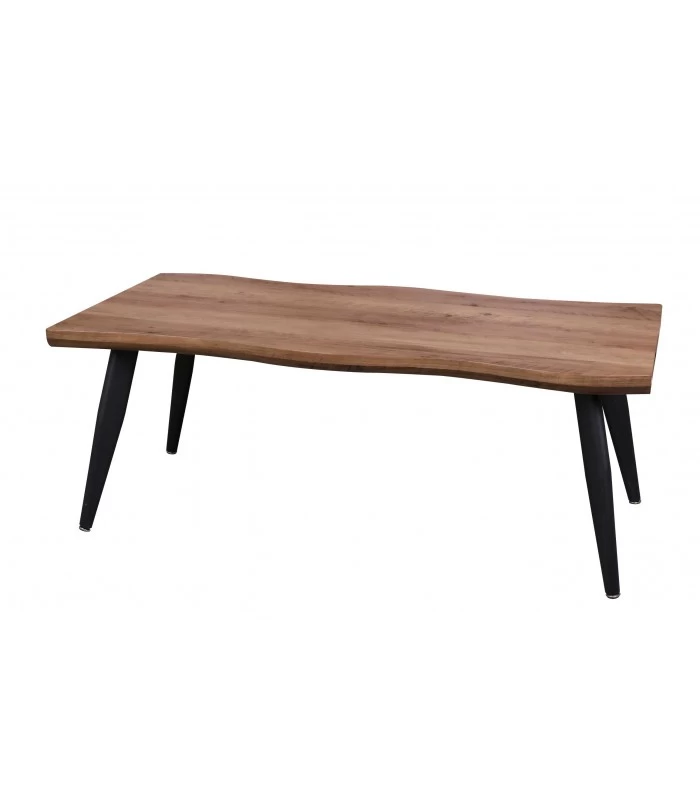 Table basse avec plateau en bois MDF à bordures irrégulières et pieds en métal noir.