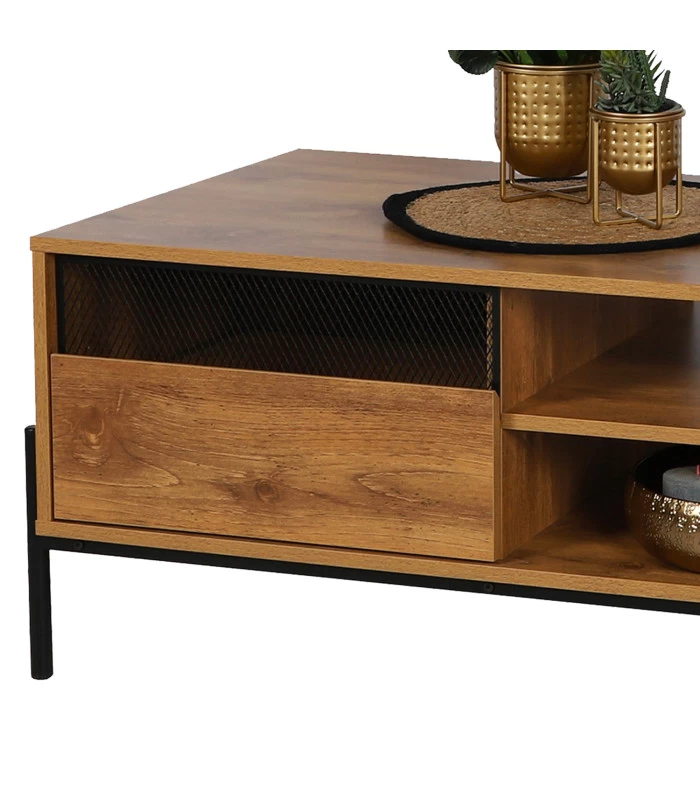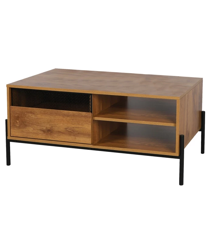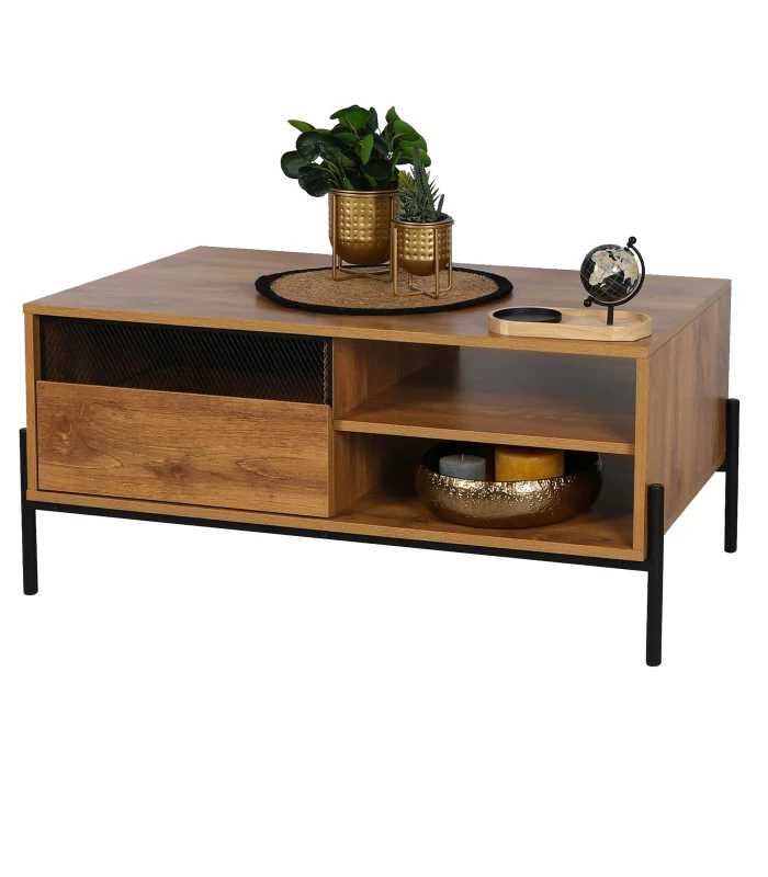 Table basse sobre et épurée en bois MDF et métal noir.