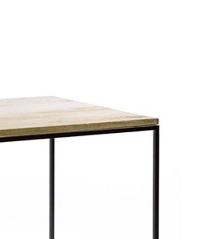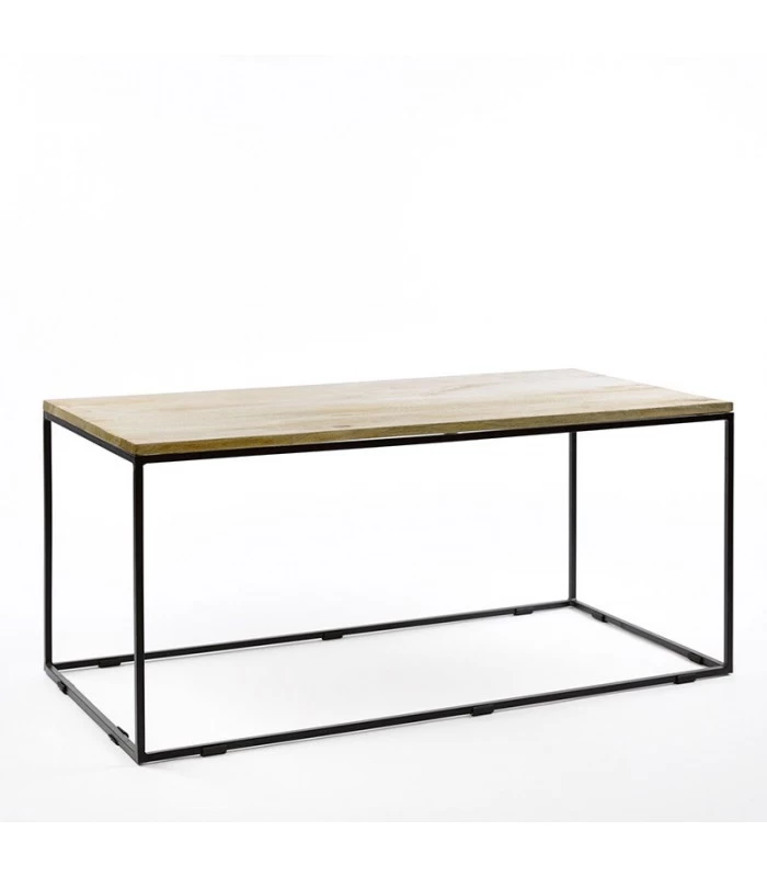 Table basse de salon composé d’une structure en métal noir et d’un plateau en bois de manguier.