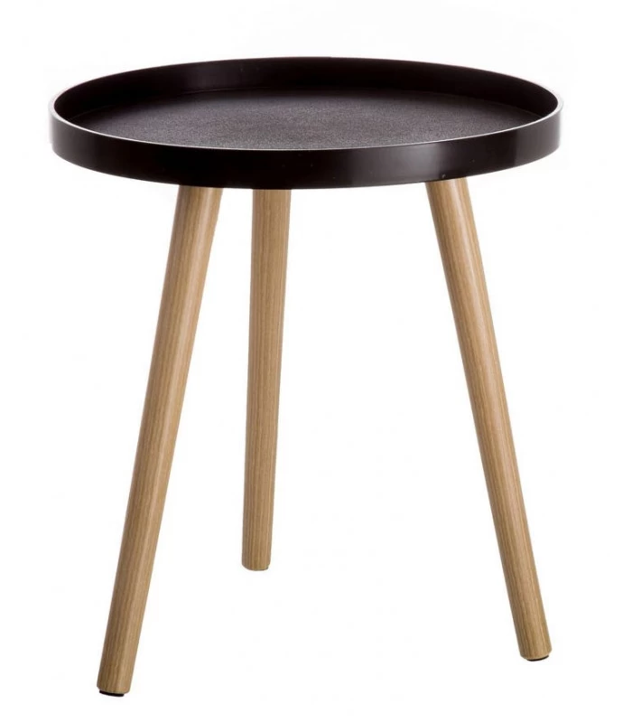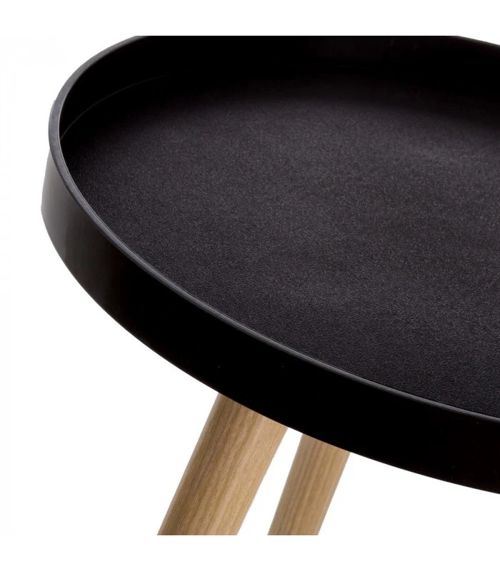 Table d’appoint ronde bicolore bois et noire avec pieds en bois MDF et plateau en polypropylène noir.
