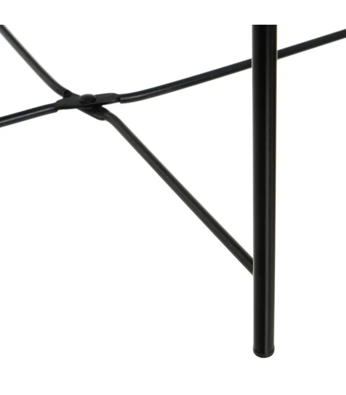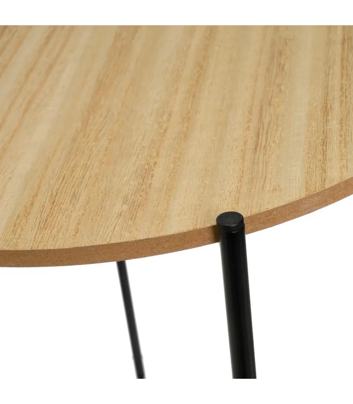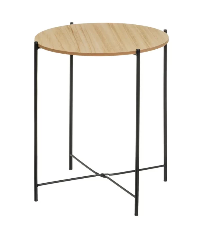 Table d’appoint ronde avec structure en métal noir et plateau en bois MDF.
