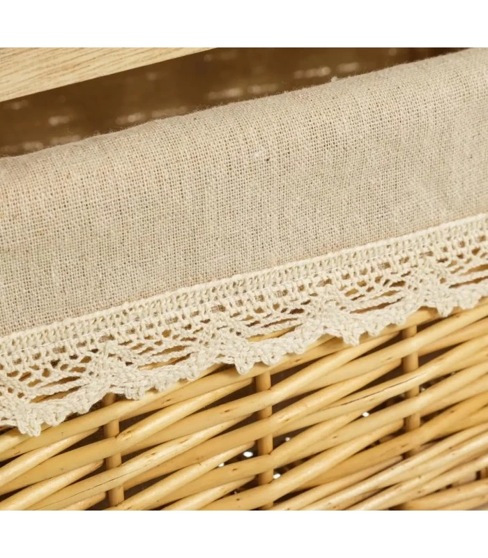 Table de chevet en bois comprenant un tiroir et un panier tressé avec intérieur en lin.
