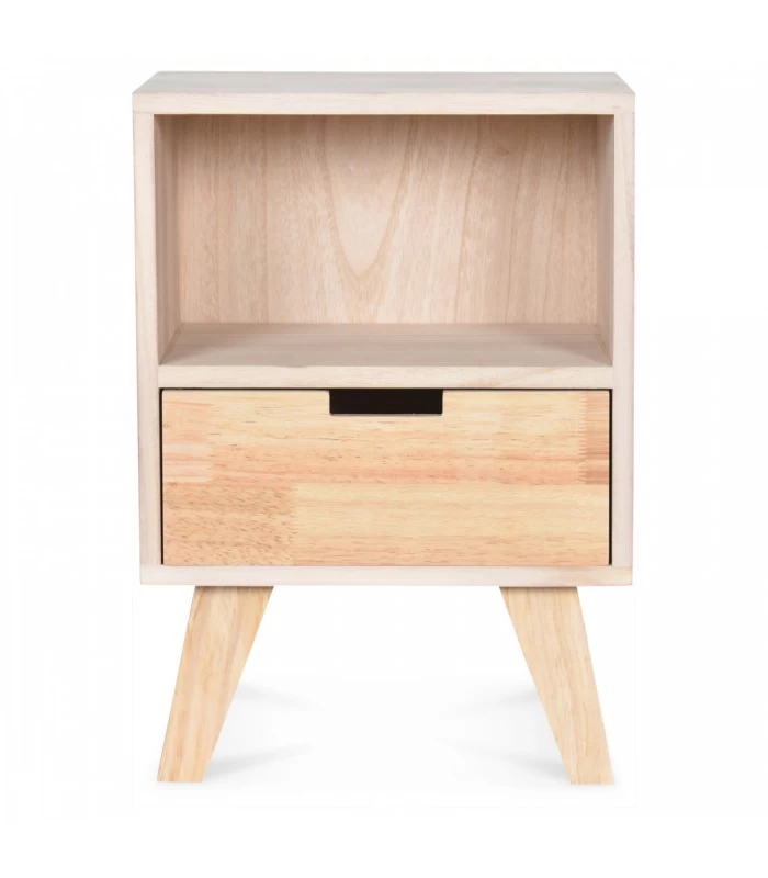 Table de chevet d’inspiration scandinave en bois. Une petite table de chevet épurée et tendance pour une chambre élégante.