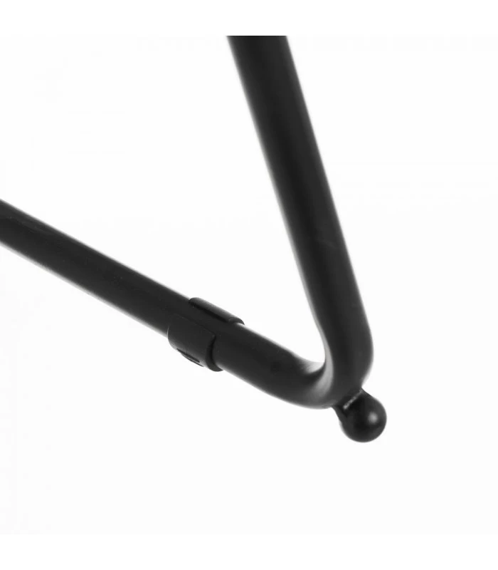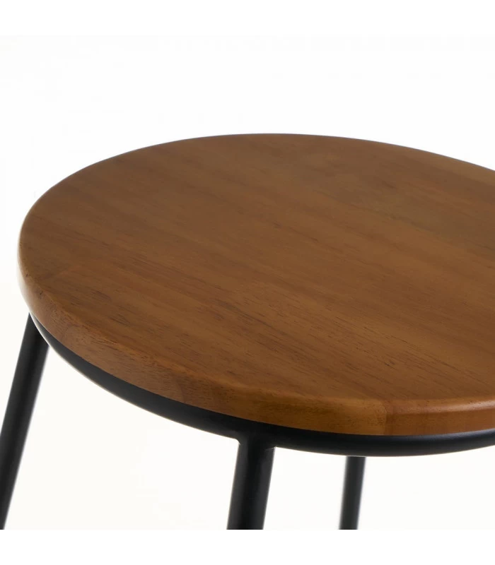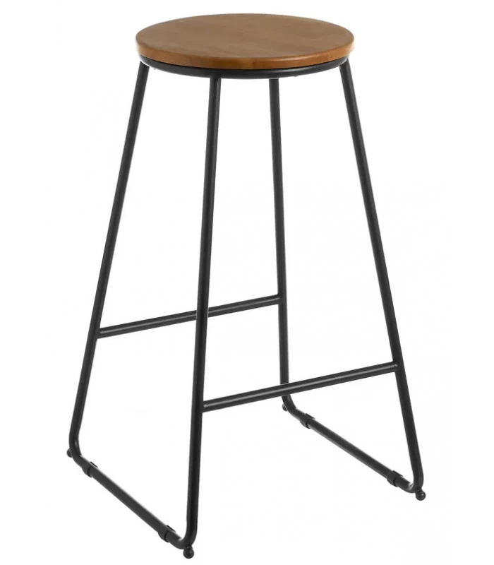 Tabouret de bar en métal noir et assise en bois de caoutchouc. Diamètre de l’assise: 32cm. Repose pied à 49.5cm du sol.
