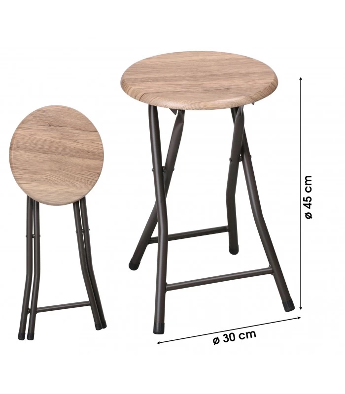 Tabouret pliable rond en métal noir et bois.