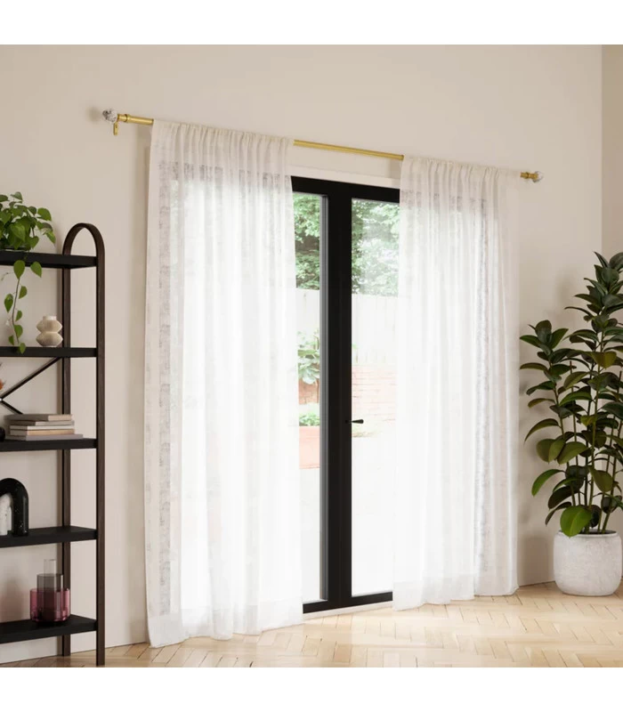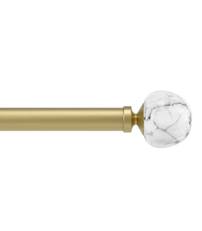 Tringle à rideaux en métal doré et boules en résine blanche effet marbre. Tringle extensible de 93 à 183cm.