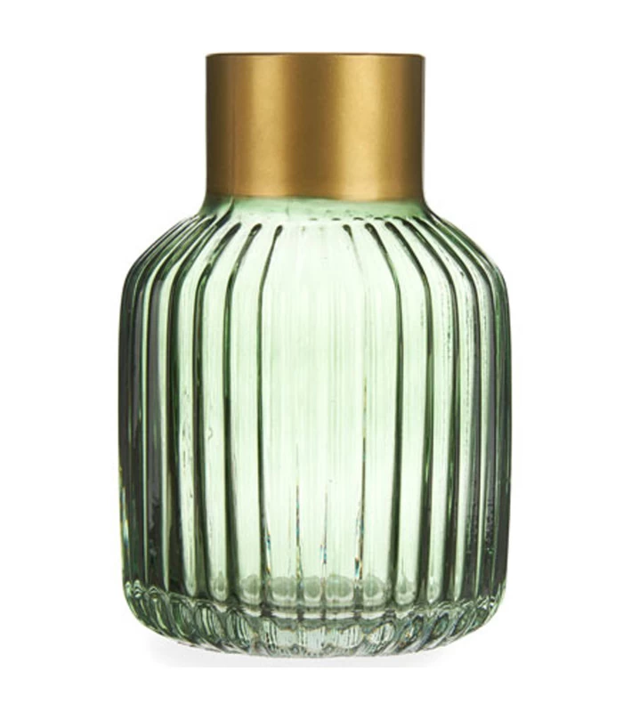 Joli vase parfaitement dans la tendance en verre strié et touche dorée. Un vase doré très décoratif vide ou avec bouquet.